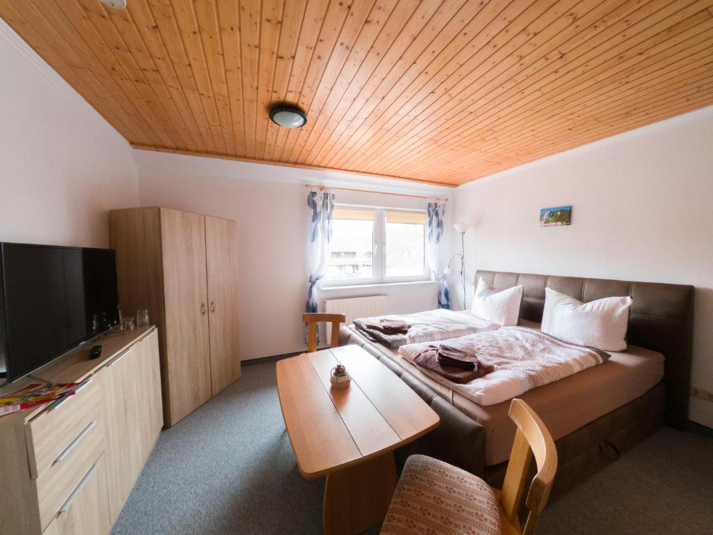 Zur Ausstattung gehören ein Schrank, Tisch und Sitzgelegenheiten, sodass ausreichend Stauraum und Komfort gewährleistet sind. Moderne Flachbild-TVs mit Sat-Empfang und kostenloses WLAN sorgen für Unterhaltung und Konnektivität. Jedes Zimmer verfügt über ein eigenes Bad mit Dusche, WC, Fön und frischen Handtüchern. Es handelt sich um Nichtraucherzimmer, die täglich gereinigt werden. Der Zugang erfolgt bequem mit eigenem Zimmerschlüssel, und die oberen Zimmer sind über eine Treppe erreichbar. Damit bietet die Pension eine saubere, zweckmäßige und komfortable Unterkunft für Reisende, die Wert auf Funktionalität und ein gutes Preis-Leistungs-Verhältnis legen.